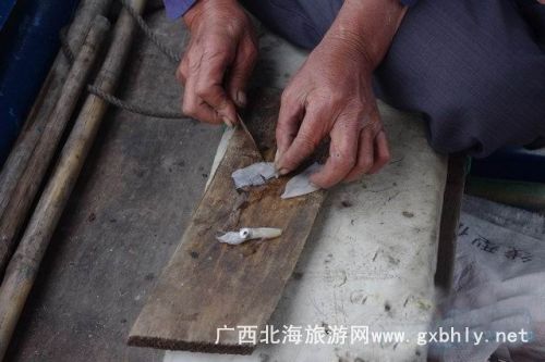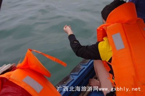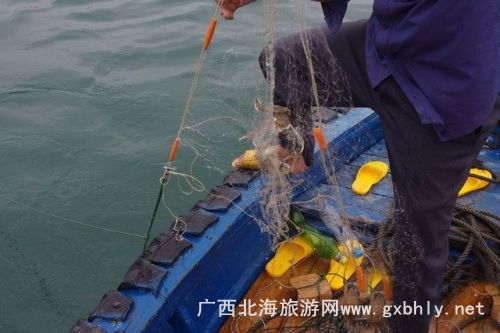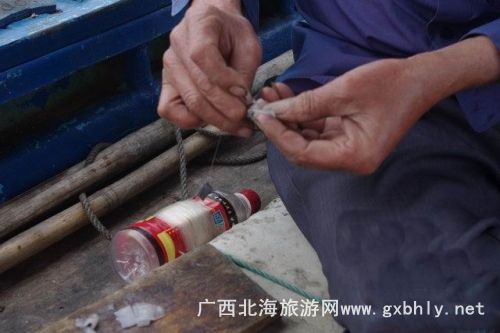 在等著魚兒撞網(wǎng)的一個(gè)小時(shí)里,我們?cè)诖笫宓闹笇?dǎo)下開(kāi)始了釣魚。先是用小刀將提前準(zhǔn)備好的魷魚,切成小塊當(dāng)誘餌,我們的釣魚工具很特殊,一個(gè)罐瓶子卷著釣線,漁夫告訴我們,在深海釣魚用這種辦法比較好釣,又很有手感,當(dāng)?shù)氐臐O民出海釣魚都是這樣釣的。就這樣,我們的帥哥美女們就開(kāi)始認(rèn)真的釣了起來(lái),因?yàn)楸容^生疏,就漁夫釣了幾條石頭魚。