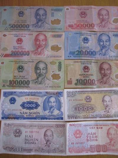 越南盾是越南的流通貨幣,它在面值有500 , 1000 , 2000 , 5000 , 10000 , 20000 , 50000 , 100000 , 200000 ,和500000盾的鈔票; 還有200 , 500 , 1000 , 2000和5000盾硬幣。美元也是公認的,但在街頭的匯率不會理想。面值較高的鈔票,包括50美元和100美元的鈔票有更好的利率,但您應該知道,破舊的美鈔也可能被拒收。外幣可以到銀行、賓館的換幣臺,寶金、寶石店換成越幣。 離開越南以前,客人沒用完的越幣可以在機場換幣臺換成外幣。