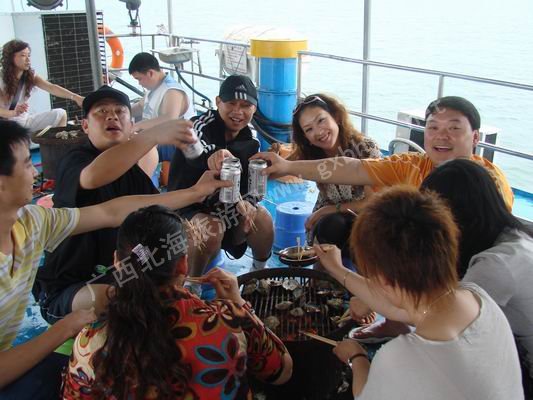 因為天氣晴好,風(fēng)浪也不大,大家都上漁船到深一點的海里撒網(wǎng),順便來個海上自助燒烤,遺憾的是本人有點暈船,沒參與到多少,大部分時間趴在船內(nèi)挺尸,不過還是奉上一張其他人玩樂照給大家看看吧,其實還蠻有趣的。