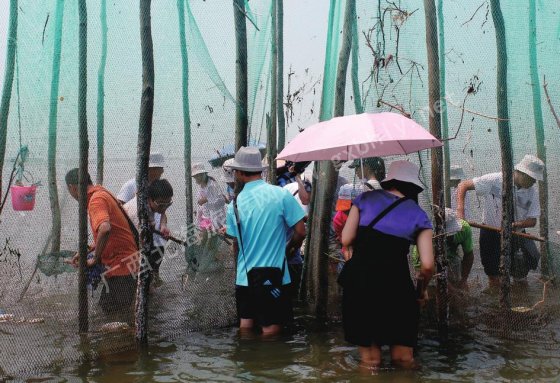 還有到漁民設(shè)的固定攔網(wǎng)里撈魚,這里就比較多魚了,男男女女都跑過去,魚就在身邊游,看誰眼明手快啦。