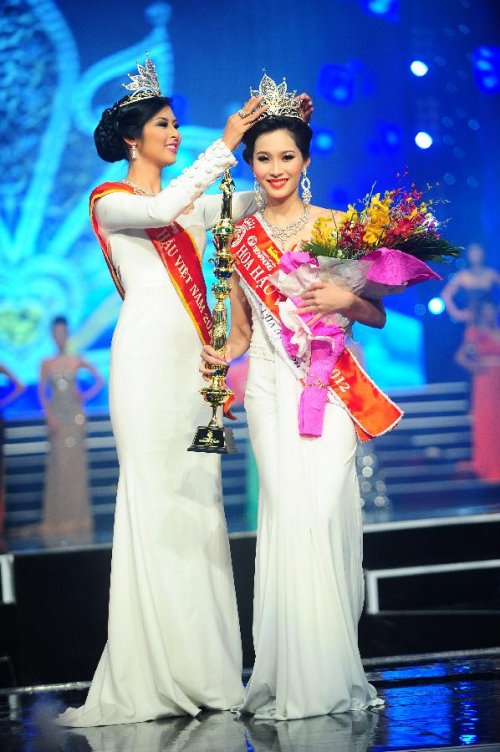 來自新華社的最新消息, 8月25日晚,在越南的峴港,獲得2012年“越南小姐”選美比賽冠軍的鄧秋草(右)接受頒獎(jiǎng)。當(dāng)日,2012年“越南小姐”選美比賽在越南中部城市峴港落下帷幕,共有約40名選手參加角逐。