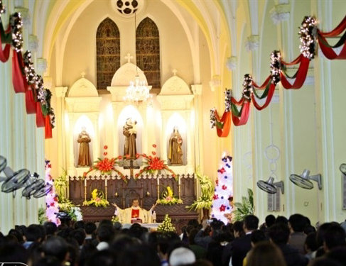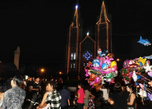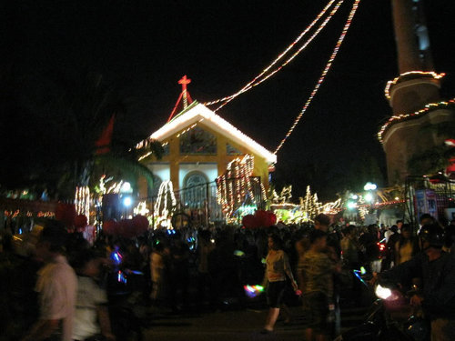 圣誕節(jié)期間,白天,小販們會叫賣著各式各樣的圣誕用品。街道上,也有成群結隊的、長著金發(fā)碧眼的老外走過。一到夜晚,大教堂便高懸華燈,吸引所有人的目光。人們在主教的帶領下用越南語吟唱著圣經,氣氛肅穆而溫暖。