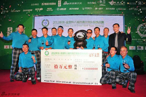 11月28日,由四川省高爾夫球協(xié)會、新浪網(wǎng)、金堂縣房地產(chǎn)業(yè)協(xié)會、至尊旅程以及觀嶺球會共同主辦的2012“新浪-金堂杯”八城市高爾夫隊際挑戰(zhàn)賽,在四川金堂藍光·觀嶺高爾夫球會隆重開賽。來自北京、上海、沈陽、南京、深圳、武漢、成都以及北海等八座城市的八支高水平業(yè)余高爾夫球隊,總計百余名高爾夫球友,為著各隊的榮譽展開了為期兩天的激烈角逐。在全國知名球隊高手如云的較量中,最終北海高協(xié)和安隊以總成績1044桿(385-659)奪得了冠軍,并獲得了10萬元的球隊發(fā)展基金,賽事主辦方還特制了富含四川傳統(tǒng)文化的蜀繡獎杯作為紀念。對于本賽事及北海高協(xié)和安隊的奪冠消息,新浪網(wǎng)及《成都商報》等主流媒體均作了頭版頭條報道。