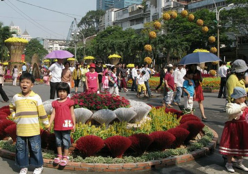 花市是越南春節(jié)重要活動之一。比如河內(nèi),春節(jié)前約10天,花市就開始熱鬧。越南人最愛的年花有劍蘭、大麗菊、金桔和桃花。除了鮮花、盆景,花市還出售各式氣球、彩燈、玩具、年畫、春聯(lián)、年歷等,把相連的幾條街道裝點得五彩繽紛,喜氣洋洋。