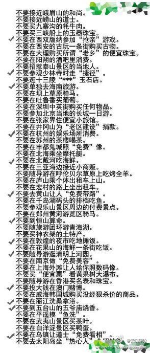 這份資料號稱“旅行社內(nèi)部絕密資料”,“絕密”二字,吊足了網(wǎng)友的胃口。資料里羅列了50個(gè)不同景點(diǎn)的注意事項(xiàng),每一項(xiàng)均是提醒人們,在某某景點(diǎn)“不要做的事”,其中打鉤的更是重點(diǎn)防范處。