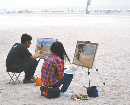 17日上午,兩位青年在潔白的銀灘寫生。 廖德光 攝