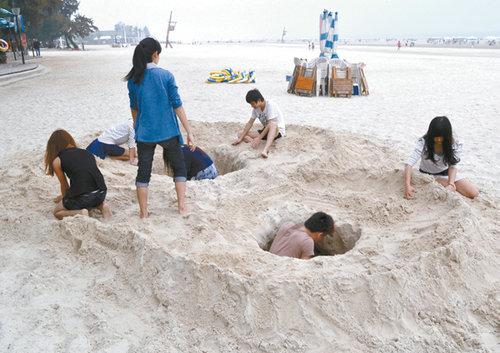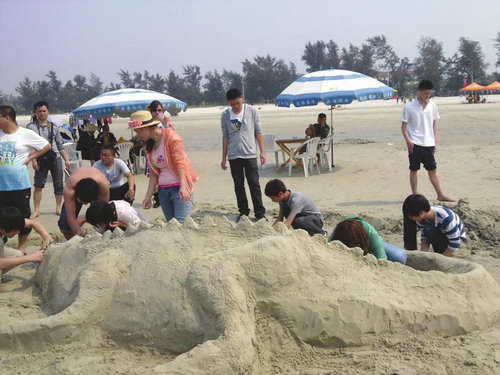 另外4月15日 北海藝術(shù)設(shè)計(jì)職業(yè)學(xué)院第十三屆學(xué)生運(yùn)動(dòng)會(huì)及沙雕比賽在銀灘舉行。大學(xué)生們享受看陽(yáng)光/海水、沙灘,參加運(yùn)動(dòng)會(huì)的同學(xué)在激烈競(jìng)技,參加沙雕比賽的忙著創(chuàng)作參賽作品,整個(gè)銀灘成了運(yùn)動(dòng)和藝術(shù)的天堂。