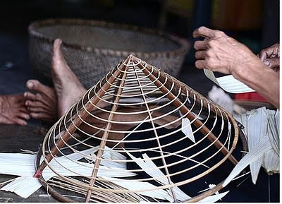 越南人制作斗笠的原料并不講究,斗笠一般使用成熟的竹子,把竹子劈開成圓形的小小條、作為骨架、做成圓錐形,之后把他們放在燒柴廚房的廚架上面以防蟲子,而且更加堅韌。一般斗笠骨架做成16圈、疊成16層、有不同的半徑,并用絲線把它固定起來。附上上面一層層的是使用堅韌的葵絲,棕櫚葉,竹葉等葉子編成,然后使用針線固定它,縫紉的針腳全憑非常均勻,毫厘不差,縫紉時必須靠著每一圈骨架縫起來。一般編成斗笠之前要選好的、比較完整的葉子、洗干凈、曬干,然后把它染成白色,編成之后再涂上一層有點點黃的斗笠專用油加以光滑并有不滲水的作用,涂上油之后那他曬干一天時間左右就可以使用,可以拿去賣了。