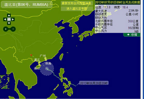 中央氣象臺1日06時繼續(xù)發(fā)布臺風(fēng)藍色預(yù)警:今年第6號熱帶風(fēng)暴“溫比亞”的中心7月1日05時位于廣東電白東南方約560公里的南海中部海面上,就是北緯17.7度,東經(jīng)114.6度,中心附近最大風(fēng)力有9級(23米/秒),中心最低氣壓為992百帕,7級風(fēng)圈半徑350公里。