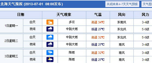 北海市氣象臺2013年07月01日08時51分發(fā)布臺風(fēng)藍色預(yù)警信號:預(yù)計未來24小時內(nèi)受今年第6號熱帶風(fēng)暴“溫比亞”的影響,北部灣海面及我市沿海將出現(xiàn)7級,陣風(fēng)9到10級大風(fēng)。