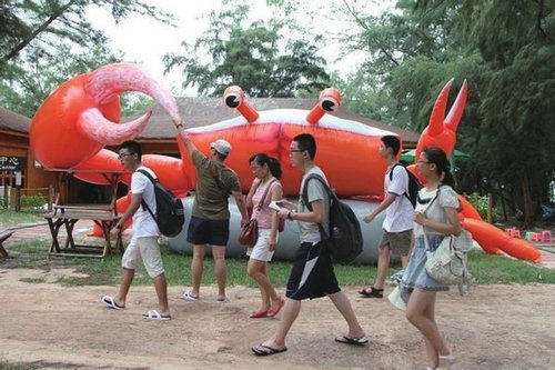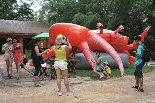 7月28日上午,一只長(zhǎng)10米,寬6米,高4米,由PVC材料制成、顏色鮮艷的大型氣!罢谐毙贰绷料啾焙=鸷臣t樹(shù)林風(fēng)景區(qū)。大型“招潮蟹”一出現(xiàn)立即吸引眾多游客的眼球,小朋友更是興奮不已,連忙爬到巨大的蟹腳、蟹爪上玩、或抬或敲,玩得十分盡興。不少游客駐足觀看,招呼同伴和“招潮蟹”合影留念。一位游客告訴記者,這只“招潮蟹”憨厚可愛(ài),惟妙惟肖,他們從重慶到北海旅游,第一次見(jiàn)到如此龐大的氣模螃蟹,和“招潮蟹”合影可以沾點(diǎn)喜氣。