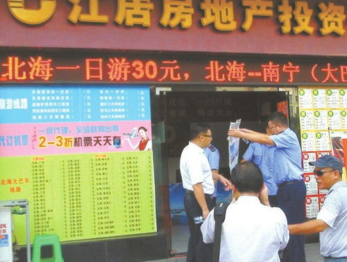 近日,為徹底清理和打擊以“一日游”為旗號(hào)的涉嫌傳銷違法行為,凈化旅游環(huán)境,維護(hù)城市形象,北海市旅游、工商、公安、交通運(yùn)輸、住房和城鄉(xiāng)建設(shè)等局專門發(fā)出了清理打擊以“一日游”為旗號(hào)涉嫌傳銷違法行為的通告,并根據(jù)市民提供的線索,開展聯(lián)合執(zhí)法。執(zhí)法人員分別對(duì)“寄生”于北海大道九福東盟自貿(mào)城西邊的火車售票處、重慶東路蒙之海投資有限公司和北海大道九福東盟自貿(mào)城西邊江居房地產(chǎn)投資公司三個(gè)屢教不改的黑窩點(diǎn)進(jìn)行了查處,當(dāng)場(chǎng)清除了6塊非法廣告招牌,沒收“一日游”非法宣傳資料10萬多份,工商部門還對(duì)涉案經(jīng)營(yíng)單位存在的超范圍經(jīng)營(yíng)、非法經(jīng)營(yíng)“一日游”和頂風(fēng)作案等行為進(jìn)行立案查處。(北海日?qǐng)?bào)9月4日訊)