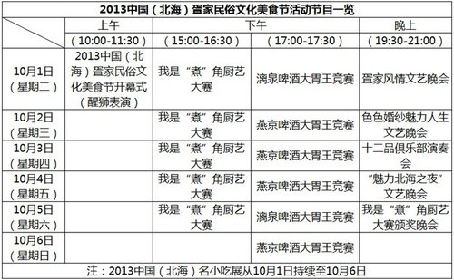 本屆中國(北海)疍家民俗文化美食節(jié)將于10月1日-10月6日在海灘公園舉辦,共計6天。其中,10月1日當天上午10點將會舉行開幕式(醒獅表演),“2013中國(北海)名小吃展”也將會貫穿整個美食節(jié),將有北海著名小吃的代表性企業(yè)前來參展。而“我是‘煮’角廚藝大賽”則由北海美食愛好者與市民參賽,由北海餐飲界著名廚師(原富麗華行政總廚伍新偉、北海雄飛漁港行政總廚黃志平等人)擔任評委,比賽內容包括現(xiàn)場美食創(chuàng)作和指定材料創(chuàng)作等,還會與游客進行互動。