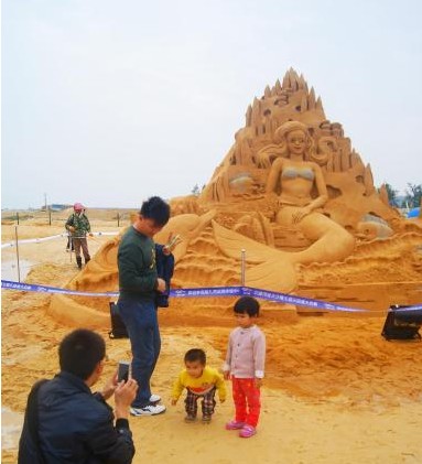 其中,展現(xiàn)中國與東盟國家友好歷史往來的“碧海絲路”高12米、長20米、寬18米。此次展出的8座巨型沙雕由來自浙江的一個團隊歷時近1個月創(chuàng)作而成,在11月中旬時曾被今年第30號臺風“海燕”摧毀而重塑。