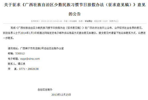 12月25日,從自治區(qū)法制辦獲悉,《廣西壯族自治區(qū)少數(shù)民族習(xí)慣節(jié)日放假辦法(征求意見稿)》在廣西政府法制網(wǎng)上公布,擬在“農(nóng)歷三月三歌圩節(jié)”全區(qū)放假兩天。即日起至2014年1月3日,該征求意見稿公開征求社會各界意見。