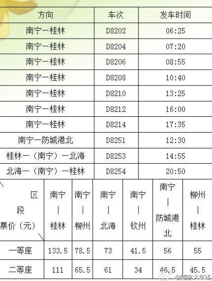 據(jù)悉,從北海火車站發(fā)出的北!鹆质琢休d客動車D8254,將于30日19:10分發(fā)車,20∶31分到達南寧、22∶24分到達柳州、23∶29分到達桂林。當(dāng)天桂林~北海發(fā)車時間為11∶55,16∶18到達北海。南寧至北海動車一等座73元、二等座61元;柳州至北海動車一等座144元、二等座119.5元;桂林至北海動車一等座198.5元、二等座166元。
