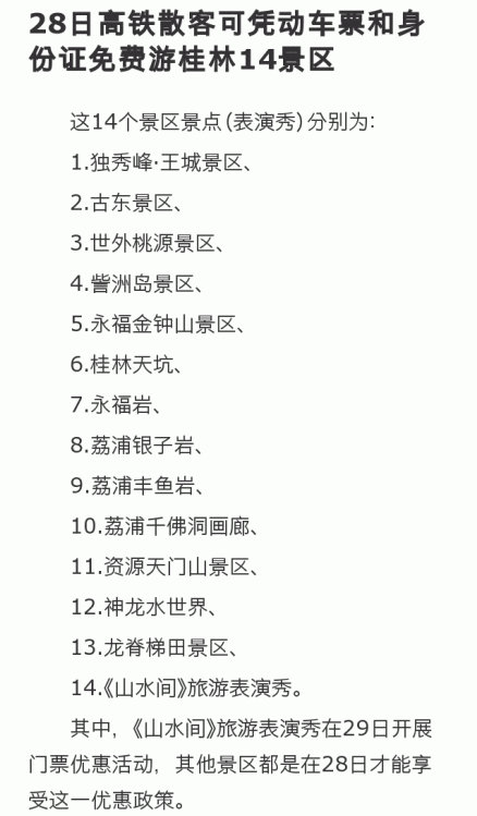 另外,值得注意的是高鐵開通在即,旅游部門紛紛啟動『高鐵營銷』模式。12月28日零時至24時,搭乘高鐵動車來桂林的散客都可在28日當(dāng)天,憑本人動車票和身份證,在桂林14個景區(qū)景點(表演秀)享受門票免費的優(yōu)惠政策。