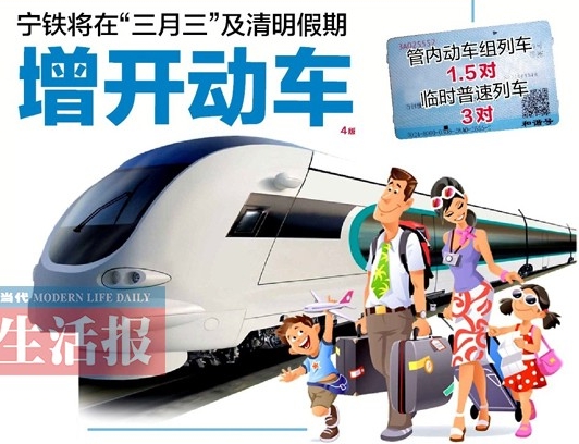 鐵路部門(mén)預(yù)計(jì),清明小長(zhǎng)假期間將完成旅客發(fā)送75萬(wàn)人次,其中客流高峰日出現(xiàn)在4月7日,高峰日客流約為20.0萬(wàn)人。為滿(mǎn)足清明期間旅客出行需求,南寧鐵路局將在4月4日至7日間每日增開(kāi)1.5對(duì)動(dòng)車(chē)組列車(chē),其中南寧—東安東間加開(kāi)D8218次、東安東—北海間加開(kāi)D8261次、北海—南寧間加開(kāi)D8262次,使用CRH2A型動(dòng)車(chē)組重聯(lián)(共16節(jié)車(chē)廂)運(yùn)行。在4月2日至7日間增開(kāi)柳州~梧州K9341/4 K9343/2次、南寧~玉林K9346/7 K9348/5次、南寧~崇左5531/2次管內(nèi)臨時(shí)圖定普速客車(chē)3對(duì)。同時(shí),在重點(diǎn)方向圖定客車(chē)上日均安排加掛152輛次,其中直通客車(chē)加掛38輛次、管內(nèi)客車(chē)加掛114輛次。增開(kāi)動(dòng)車(chē)組和管內(nèi)臨客以及加掛運(yùn)能,將較日常日均增加運(yùn)力3.1萬(wàn)位。