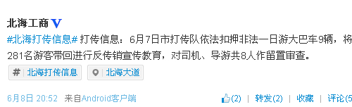 另外,來自北海工商官方的最新消息,6月7日市打傳隊(duì)依法扣押非法一日游大巴車9輛,將281名游客帶回進(jìn)行反傳銷宣傳教育,對司機(jī)、導(dǎo)游共8人作留置審查。