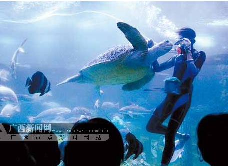 來自廣西新聞網(wǎng)的消息,6月16日,一名潛水員正在北海市的“海底世界”飼喂海龜?shù)壬铮齺砹舜笈鷩^的游客。近年來,北海市以旅游業(yè)為龍頭,積極發(fā)展現(xiàn)代型服務業(yè),促進產(chǎn)業(yè)轉(zhuǎn)型。該市目前年接待國內(nèi)旅客均在1500萬人次左右,成為廣西最重要的旅游集散地之一。