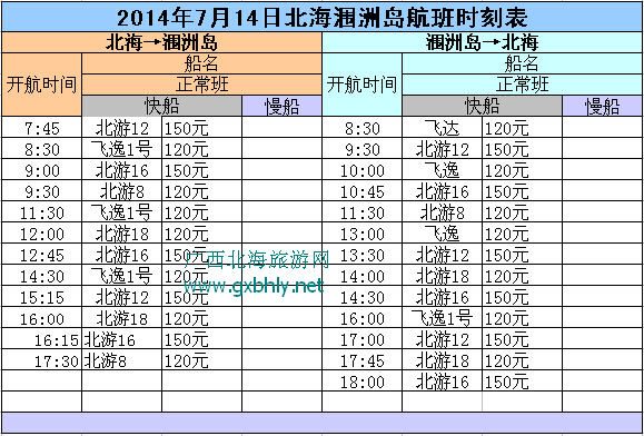 2014年7月14日星期一北海潿洲島航班時刻表: