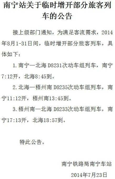 另外來自南寧鐵路局的消息,為了應對暑期出行高峰,下月起北海方向動車將臨時增開: