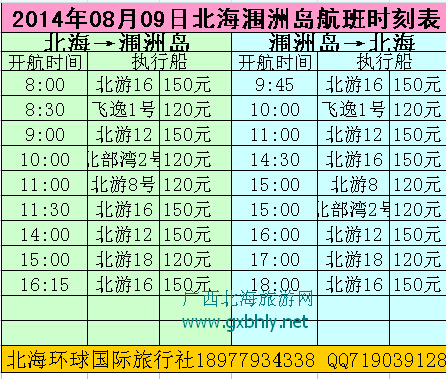 2014年8月9日北海潿洲島航班時(shí)刻: