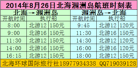 2014年8月26、27日的北海潿洲島航班時(shí)刻安排如下: