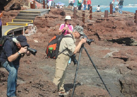11月5日,秋日里的潿洲島天氣晴朗,綠樹(shù)環(huán)繞的島嶼更顯秀美壯麗。攝影家們不顧遠(yuǎn)道的疲勞,他們被潿洲島的景觀深深吸引,在鱷魚(yú)山公園、五彩灘、天主教堂,大家紛紛舉起各自手中的“長(zhǎng)槍短炮”,選取角度,認(rèn)真構(gòu)圖,記錄下這最美的瞬間。