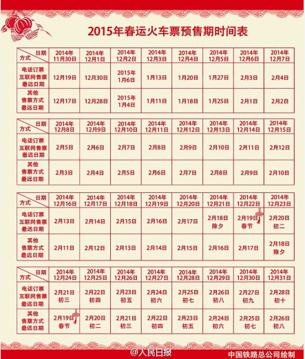 根據(jù)新的預(yù)售期安排,12月7日,旅客就可以購買2015年鐵路春運(yùn)第一天的火車票了。鐵路部門計劃春運(yùn)結(jié)束后,火車票的預(yù)售期仍保持60天。車站窗口等其他售票方式仍按錯后兩天的原則同步執(zhí)行。