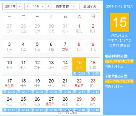 據(jù)中國之聲《全國新聞聯(lián)播》報道,中國鐵路總公司今天發(fā)布:從12月1號起,鐵路互聯(lián)網(wǎng)售票、電話訂票的預(yù)售期將由目前的20天逐步延長至60天。12月7號起,將開始發(fā)售2015年鐵路春運(yùn)火車票。車站窗口等其他售票方式仍按錯后兩天的原則執(zhí)行。