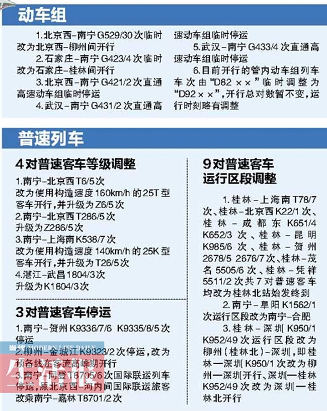 南寧鐵路局有關負責人介紹:12月10日,全國鐵路將實施新的列車運行圖,南寧鐵路局由于貴廣、南廣及南寧東站、新桂林北站開通日期為界,分兩個階段過渡、實施新的列車運行圖。第一階段變化較大,從2014年12月10日至年底南寧東站及貴廣客專、南廣鐵路全線開通運營前,第二階段為南寧東站及貴廣客專、南廣鐵路全線開通運營起。其中,第一階段為臨時過渡階段,南寧鐵路局啟用臨時列車運行圖,在確?缇致每土熊囌c到發(fā)的前提下,區(qū)內外開行的動車組列車及普速旅客列車均發(fā)生較大變化。