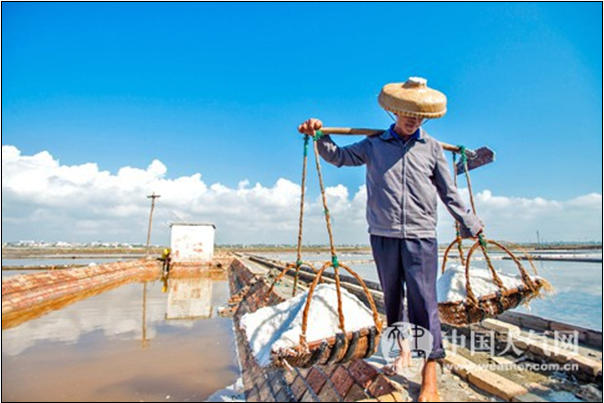 在竹林鹽場(chǎng)一個(gè)個(gè)方形的鹽田里,一男一女兩名工人正在清理池底,在淺淺的海水里,結(jié)晶池露出了由紅磚鋪砌的池底,非常醒目。對(duì)于工區(qū)的鹽工而言,每天的工作從凌晨四點(diǎn)左右開(kāi)始。“那時(shí)每天那個(gè)時(shí)候氣溫最低,適合收鹽!丙}工劉叔解釋道。收鹽,是用木耙把鹽勻到簸箕里,再一擔(dān)一擔(dān)挑到鹽田邊的倉(cāng)庫(kù)里。“每擔(dān)兩百多斤的海鹽,就靠一個(gè)人扛上來(lái),非常辛苦!弊隽20年的劉叔感慨。