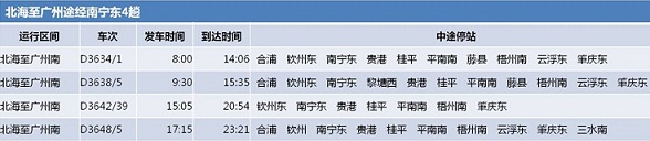 北海-廣州動車4趟中有3趟經(jīng)過合浦,而最快的是15:05發(fā)車的D3642/39動車,途經(jīng)7個站,不過合浦,20:54到達,車程5小時49分鐘。