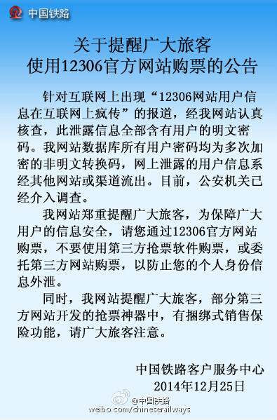 針對互聯(lián)網(wǎng)上出現(xiàn)“12306網(wǎng)站用戶信息在互聯(lián)網(wǎng)上瘋傳”的報道,經(jīng)我網(wǎng)站認真核查,此泄露信息全部含有用戶的明文密碼。我網(wǎng)站數(shù)據(jù)庫所有用戶密碼均為多次加密的非明文轉(zhuǎn)換碼,網(wǎng)上泄露的用戶信息系經(jīng)其他網(wǎng)站或渠道流出。