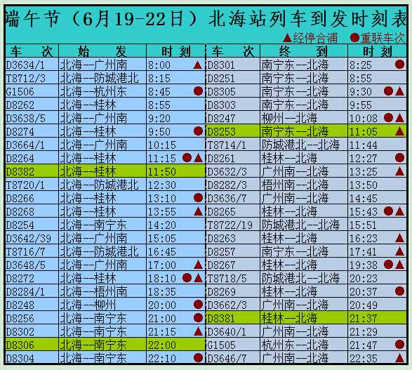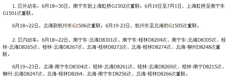 端午節(jié)(6月19-22日)南寧鐵路局將在北海方向增開(kāi)多趟動(dòng)車(chē)、現(xiàn)有部分動(dòng)車(chē)重聯(lián),具體如下