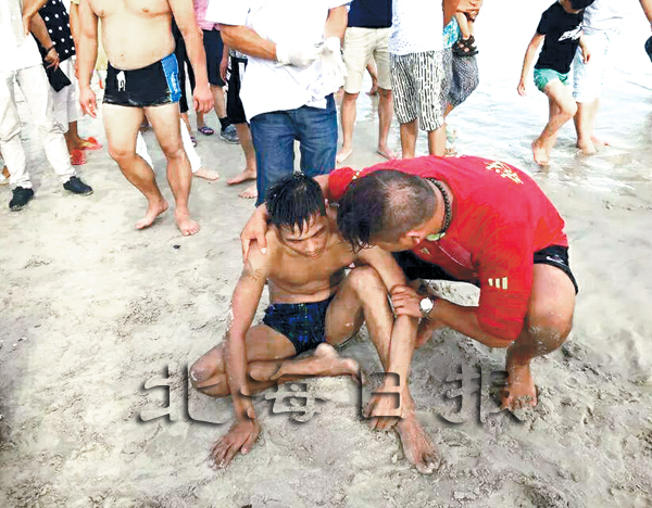7月2日風(fēng)浪特別大,當(dāng)班的全體救生隊員提高警惕,加強浴場海面的巡邏防范工作。當(dāng)天約16時55分,正在海灘救生塔上值班的海上救生隊裴全偉在監(jiān)控中突然發(fā)現(xiàn),浴場外東面碼頭處有游客被西南浪卷走,立即用對講機呼叫正在浴場駕救生艇巡邏的隊友王德歡。王德歡接到求救信息后,立刻火速調(diào)轉(zhuǎn)艇頭加大油門,僅用10秒鐘就趕到事發(fā)海域。王德歡一邊將艇靠近并把救生圈(衣)拋給游客,一邊用對講機向分管救生工作的李海濤匯報請求支援。王德歡拋去救生衣,但游客無反應(yīng),只見其時沉?xí)r浮。危急關(guān)頭,救生員王德歡不顧個人安危,從救生艇上跳進(jìn)大浪中成功救起游客,這時李海濤帶領(lǐng)4名隊員快速趕到支援,大家合力將昏迷的游客抬到沙灘上開展一系列緊急搶救措施,接到報告的銀灘景區(qū)醫(yī)務(wù)室2名醫(yī)生也在第一時間趕到現(xiàn)場開展搶救工作,約17時40分,“120”急救中心車輛和醫(yī)生趕到將游客送往市級醫(yī)院救治。