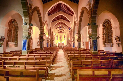 潿洲島的教堂也是慕名而去;疑奶熘鹘烫茫倭⒃谕瑯踊疑奶炜障,哥特式的尖頂顯得異常肅穆。盛塘天主堂是中國西南地區(qū)最宏偉的天主教堂,是當(dāng)年法國傳教會在北海建造最早的教堂,也是我國現(xiàn)存幾座較大的天主教堂之一。教堂里,紅色燈光溫暖寧靜,一排排整齊的禱告椅,拱弧形的屋頂,美麗的玻璃花窗,都是訴說上世紀(jì)的滄桑歲月。