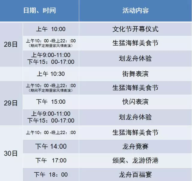 5月28日、29日兩天,市民游客可親身體驗劃龍舟,與僑港人民一起競渡風(fēng)情僑港。每艘龍船每次可接待10名游客,根據(jù)當(dāng)?shù)仫L(fēng)俗習(xí)慣,女士上鳳艇,男士上龍舟。鳳艇有專門人士劃行,女士可搭乘鳳艇伴龍舟一起出行,為體驗?zāi)惺考佑椭。對于許多北海人來說,精彩的龍船表演只是一道“開胃菜”,而另一場重頭戲已經(jīng)悄悄拉開了序幕.....那就是百福宴“龍舟飯”。精挑細(xì)選的食材,極具僑港美食特色。有龍舟飯必備的龍舟酒,燒豬等。