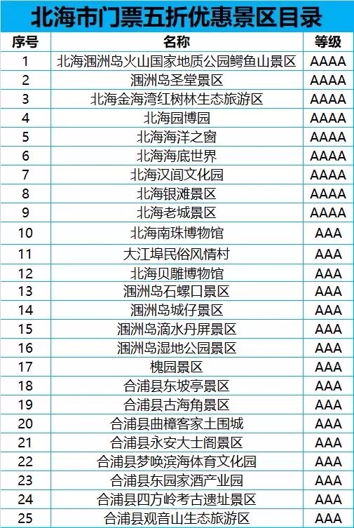 2018年4月12日至2018年5月12日(4月29日至5月1日三天五一假除外),福建、廣東、廣西、貴州、海南、湖南、江西、四川、云南、香港和澳門特別行政區(qū)等11個地區(qū)游客憑居民身份證,港澳居民來往內(nèi)地通行證,可享受北海25家A級景區(qū)門票5折優(yōu)惠(不包括溫泉、游樂園和景區(qū)內(nèi)索道、游船等其他特許經(jīng)營性項目)。也就是說,北海人也能享受到門票五折優(yōu)惠福利!