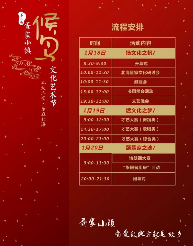 疍家小鎮(zhèn)“三天三夜·樂在北!钡诙䦟谩昂蝤B”文化藝術(shù)節(jié)秉承“交流、交融、交集”作為活動主線,確立“揚(yáng)文化之帆”、“燃文藝之夢”、“頌疍家之魂”為三個活動日的主題。