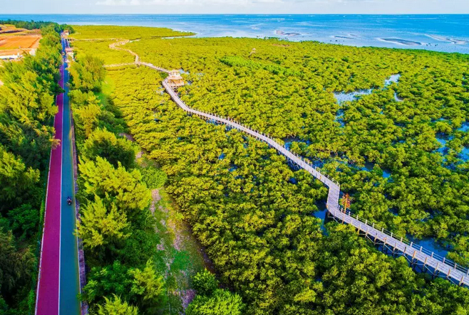 如今,一批又一批國(guó)內(nèi)外游客漫步在木棧道上欣賞紅樹(shù)林,只見(jiàn)葉綠映天,云浮潮間,海鳥(niǎo)翩翩。
