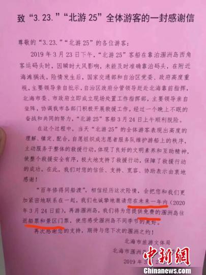 這份《感謝信》稱,“‘百年修得同船渡’,相信經(jīng)歷這次險(xiǎn)情,會(huì)把您和我們更加緊密地聯(lián)系在一起,我們將誠摯地邀請(qǐng)您在未來一年內(nèi)(2020年3月24日前),再游潿洲島。我們將為您提供免費(fèi)的潿洲島往返船票和景區(qū)門票……。