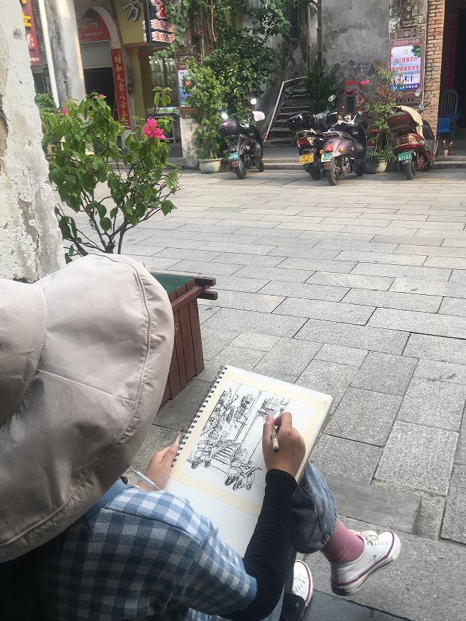 但最近兩天看到有不少年輕學(xué)生哥、學(xué)生妹都來老街寫生,感覺這老街年輕熱鬧的氣氛又回來了。以前暑假的時(shí)候,老街上會(huì)有很多全國各地藝術(shù)院校過來采風(fēng)的藝術(shù)生,她們把老城的騎樓建筑和景致“搬”上畫紙,游客也把她們認(rèn)真作畫的身影留在朋友圈。