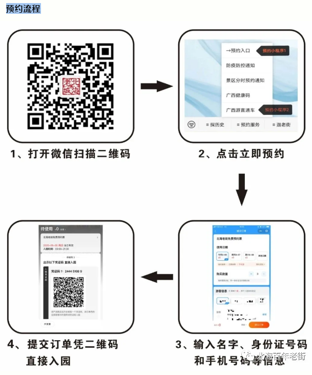 1、10月1日至8日景區(qū)實行門票分時預約制度,游客需提前在網上預約門票(免費),出示預約門票二維碼,直接入園,無需取票。游客可通過“北海百年老街”官方微信公眾號、廣西直通車、美團等小程序、電商平臺進行預約。