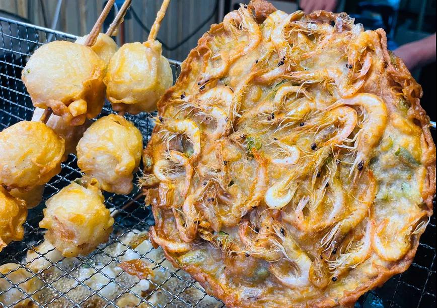 祖祖輩輩生活在海邊的北海人,靠海吃海,擅長利用生長在大海里原生態(tài)、新鮮生猛的食材烹制鄉(xiāng)土美味,造就了屬于北海的獨特味道。蝦,是北海人津津樂道的美味,白灼蝦、油爆蝦、椒鹽蝦......做法花樣百出,當然也形成了很多以蝦為食材的風味小吃——金黃酥香的蝦仔餅便是北海人共同的味蕾記憶。說到蝦仔餅,大家想到的是應該是有“近現(xiàn)代建筑年鑒”美譽的北海老街。長長的老街里,隨處可見蝦仔餅店,近年來,這道風味小吃漸漸受到游客喜愛,成為北海的網(wǎng)紅美食,游客人手一個蝦仔餅,津津有味地品嘗著。蝦仔餅契合北海疍家美食特點,有著悠久的歷史,承載著北海街頭小吃的歷史記憶,享有“中國地域十大名小吃(廣西)”的美譽,是《舌尖上的中國》推薦的名小吃。凡是來到北海老街的游客,總會被蝦仔餅的香味吸引,就算排著長隊,也要買上一個試試。蝦仔餅不僅吸引著許多游客慕名而來,也深受當?shù)厝说南矏。還記得讀書時代,經(jīng)常嘴饞了,大老遠到老街買上一個蝦仔餅,吃進嘴里那一刻,口腹之欲得到了無比的滿足。大小適中的新鮮海蝦裹上事先調(diào)味好的米糊,再撒上些翠綠的蔥花,放進油鍋里,隨著噼里啪啦的悅耳聲音,一陣陣香氣已經(jīng)飄了出來。不一會兒蝦仔餅就炸好了,老板夾起一個放在籃子里,餅上的油還在滋滋地跳躍,但人們已經(jīng)垂涎三尺,迫不及待想咬上一口了。蝦仔餅剛炸出來時最為好吃,外酥里嫩,咸香可口。喜辣的可以涂上辣椒油,撒些辣椒鹽,喜甜的可以抹上甜辣醬,那又是另外一種風味。
