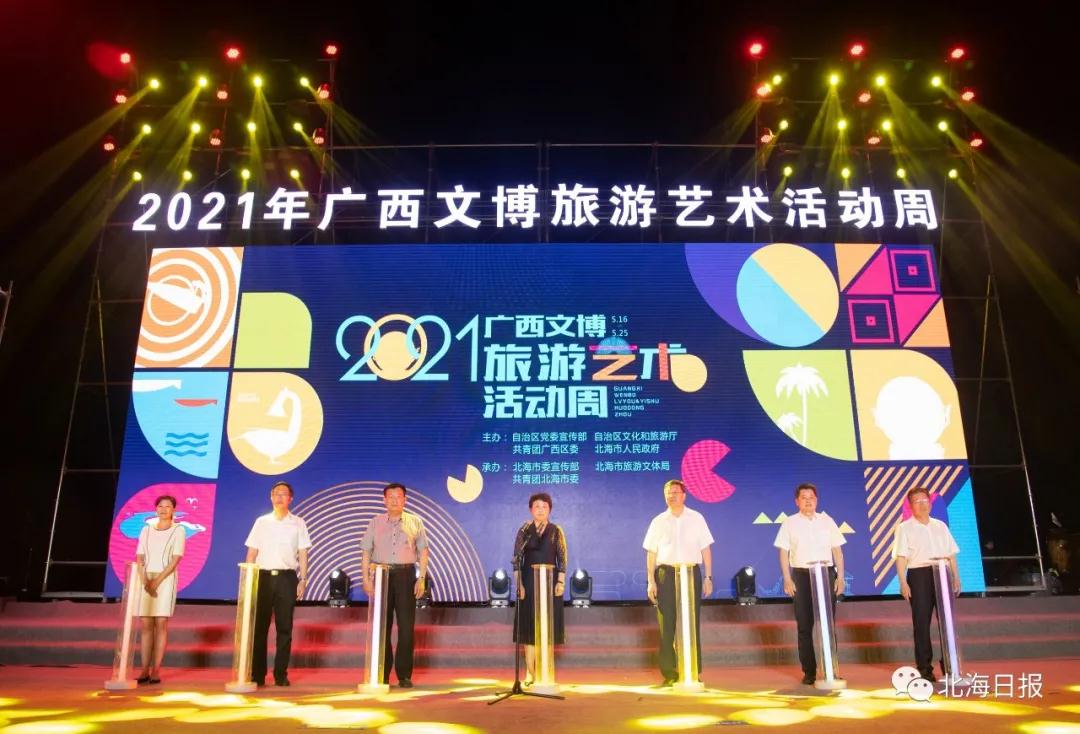 5月16日晚,由自治區(qū)黨委宣傳部、自治區(qū)文化和旅游廳、共青團(tuán)廣西區(qū)委、北海市人民政府共同主辦的2021年廣西文博旅游藝術(shù)活動(dòng)周在北海銀灘潮雕廣場(chǎng)拉開(kāi)序幕。自治區(qū)黨委常委、宣傳部部長(zhǎng)范曉莉出席并宣布活動(dòng)開(kāi)幕,自治區(qū)黨委宣傳部副部長(zhǎng)、自治區(qū)文化和旅游廳黨組書(shū)記、廳長(zhǎng)甘霖,共青團(tuán)廣西區(qū)委書(shū)記李楚,市委書(shū)記蔡錦軍,市委副書(shū)記、市長(zhǎng)廖立勇參加開(kāi)幕式。開(kāi)幕式上,范曉莉?yàn)椤敖鹋茖?dǎo)游說(shuō)廣西” 2021年廣西導(dǎo)游短視頻大賽一等獎(jiǎng)選手頒獎(jiǎng)。甘霖、李楚為“感黨恩 跟黨走—八桂青年游廣西”首發(fā)團(tuán)授旗,甘霖還為獲得“2020年國(guó)家一級(jí)博物館”榮譽(yù)稱號(hào)的單位授牌。蔡錦軍作致辭。廖立勇與自治區(qū)文化和旅游廳黨組副書(shū)記、副廳長(zhǎng)嚴(yán)霜為“2021年全區(qū)博物館講解大賽”獲獎(jiǎng)選手頒發(fā)證書(shū)。自治區(qū)文化和旅游廳黨組成員、副廳長(zhǎng)謝日萬(wàn),市委常委、宣傳部部長(zhǎng)劉伯賢為獲得“2020年國(guó)家二、三級(jí)博物館”榮譽(yù)稱號(hào)的單位授牌。廣西旅游協(xié)會(huì)執(zhí)行會(huì)長(zhǎng)龐文達(dá),同程集團(tuán)創(chuàng)始人、同程控股CEO吳劍為“金牌導(dǎo)游說(shuō)廣西”2021年廣西導(dǎo)游短視頻大賽二、三等獎(jiǎng)選手頒獎(jiǎng)。