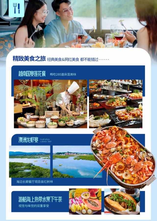 3、用餐:全程用餐7正3早餐,正餐餐標(biāo):30元/人/餐*5正+1正特色澳洲龍蝦宴+1蓮花自助餐+1法棍