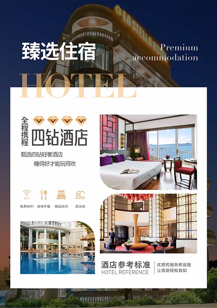 下龍(攜程四鉆):寶明輝煌、SC拉克斯瑞霍特爾、新下龍酒店、下龍灣新星酒店、下龍港酒店或其它同級(jí)別酒店。
