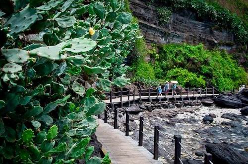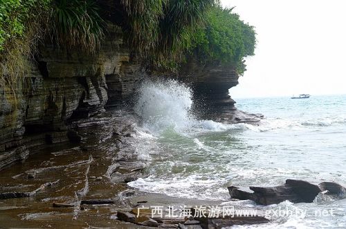 滴水丹屏在潿洲島滴水村南岸邊,原名滴水巖。絕壁上部綠樹(shù)成蔭,壁上層間裂隙常有水溢出,一點(diǎn)點(diǎn)往下滴,如朱簾垂掛。由于海蝕作用,巖石的外表形態(tài)猶如一有眼、有鼻、有嘴、有發(fā)的巨型側(cè)面“人頭像”(現(xiàn)已倒塌),景致優(yōu)美。